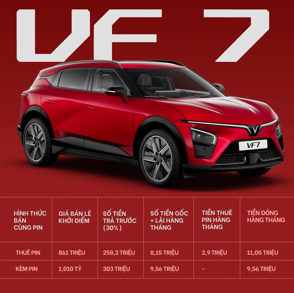 Đối với phiên bản VF7 Eco, số tiền trả trước tối thiểu là 30% giá trị của xe, tương ứng khoảng 273.433.000 VNĐ.