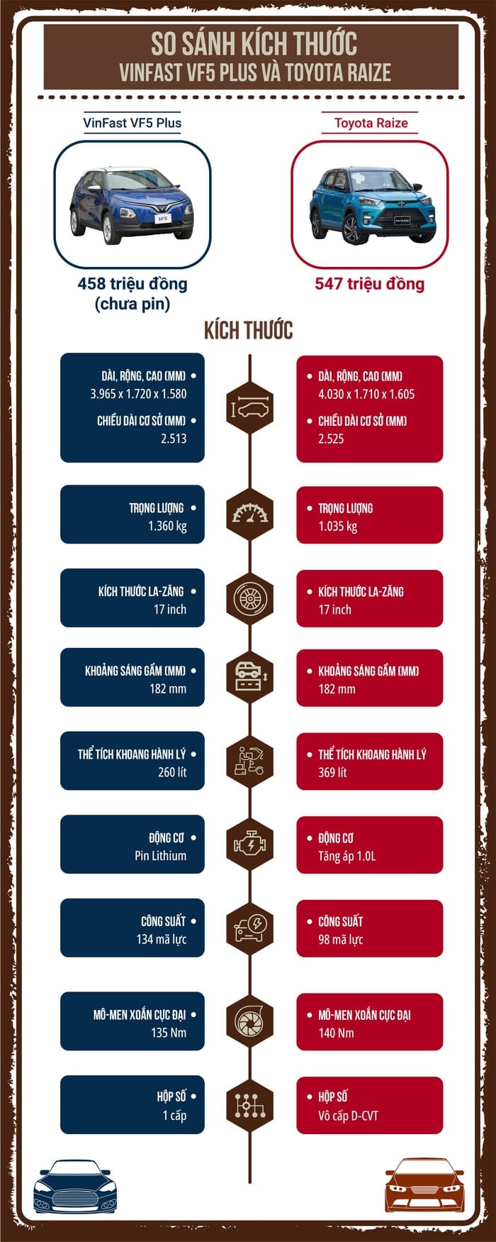 | Giá bán | VinFast VF5 có giá khởi điểm thấp hơn (458 triệu đồng) so với Toyota Raize (547 – 563 triệu đồng). |