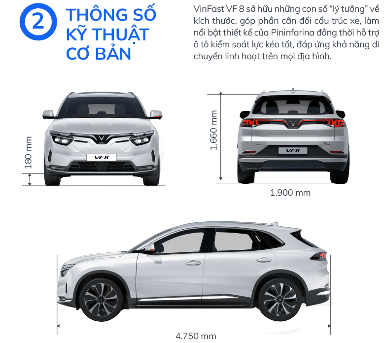 Vinfast VF8 có chiều dài 4750 mm (187.0 inches), chiều cao 1667 mm (65.6 inches), chiều dài cơ sở 2950 mm (116.1 inches), cùng chiều rộng không tính gương là 1934 mm (76.1 inches).